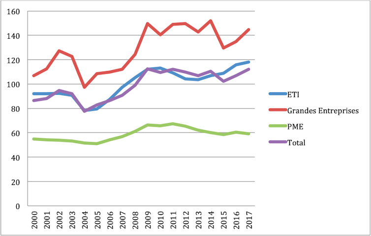 Le ratio rapportant les dettes financières aux capitaux propres reste d’ailleurs tout à fait raisonnable (inférieur à 100 %), relativement stable et inférieur à celui du début des années 2000 et ceci sans tenir compte de la trésorerie quelles que soient les catégories d’entreprises. Cela montre la solidité de la structure financière des entreprises françaises de façon générale.